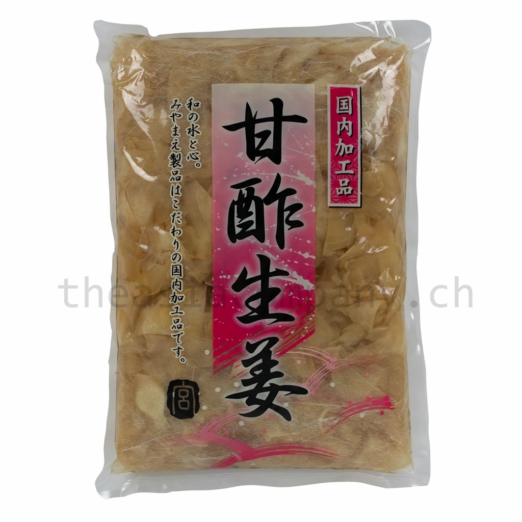 Ingwer(57.45%), Wasser(39.09%), Gewürzmischung (Salz, gebrauter Essig)(2.13%),Säurungsmittel (E260, E330, E296)(0.98%), Süssungsmittel (E954) (0.17%),Geschmacksverstärker (E621)(0.13%), Konservierungsmittel (E202)(0.05%)